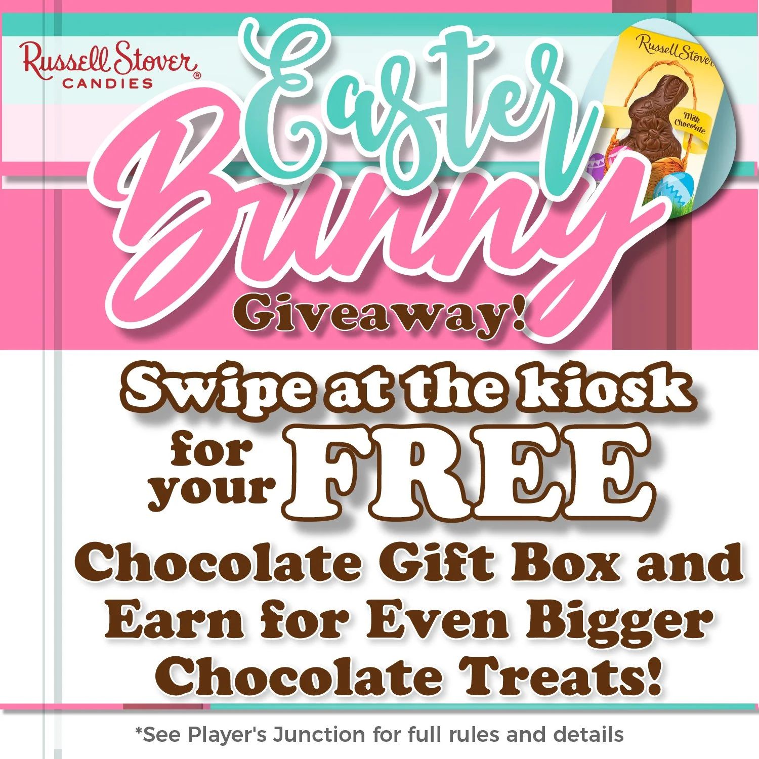 Summary: On Sunday, March 31, 2024, from 9:00am to 11:00pm, Player’s Junction members may receive a Russell Stover’s Easter chocolate gift box, while supplies last.